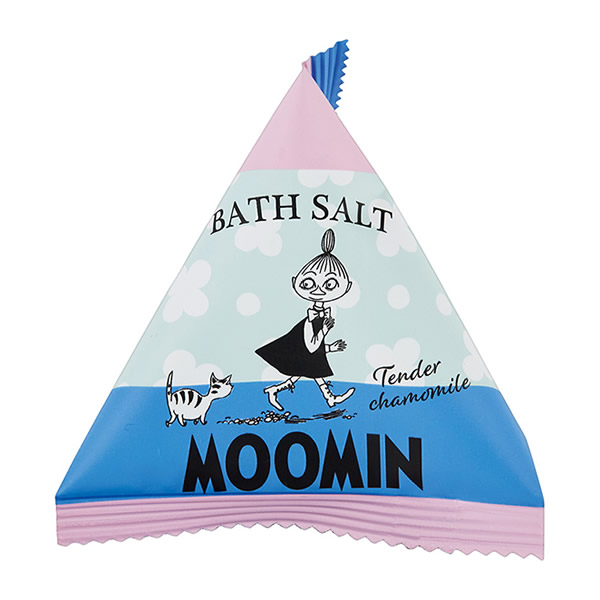 | テトラ型のムーミン柄パッケージに入ったバスソルト。 ほっとひといきのバスタイム。 [カモマイル] やさしく穏やかな甘さ、カモマイルの香り |