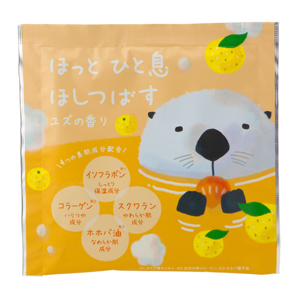 | だんだんと肌寒い日が多くなり、お風呂で過ごす時間が長くなる季節。 入浴剤を使って、ほっとひと息・・・くつろぎ空間の出来上がりです。 お風呂いっぱいに広がる心地よい香りと、4つの美肌成分がお肌をしっとりなめらかに整え、 ゆったり癒しのバスタイムをご提供します。 [4つの美肌成分] イソフラボン:しっとり保湿成分 コラーゲン:ハリつや成分 スクワラン:やわらか肌成分 ホホバ油:なめらか肌成分 [ユズ] お湯の色:クリアイエロー |