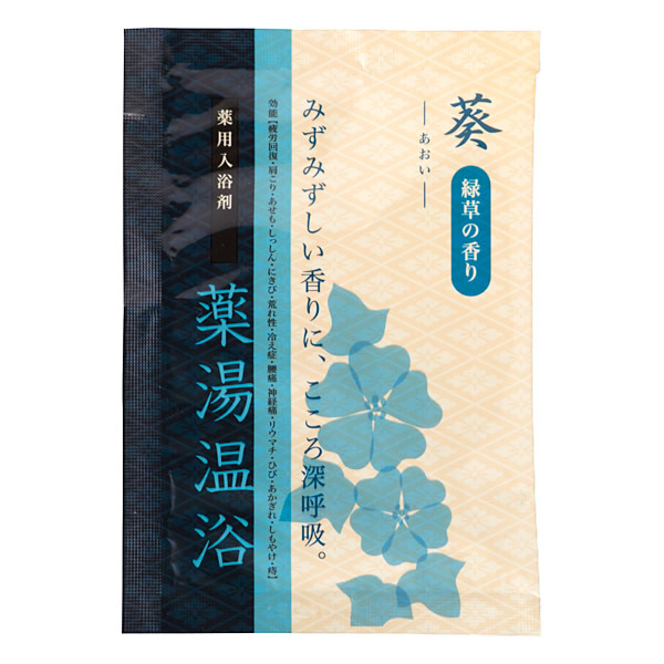 | 古来より健康を願い、薬草などの天然植物の恵みを取り入れた入浴が楽しまれています。 有効成分を配合したまろやかな湯が、やさしく肌を包み込み、 温浴効果を高め血行を促進します。 [効能] 疲労回復・肩こり・あせも・しっしん・にきび・荒れ性・冷え症・腰痛・神経痛・リウマチ・ひび・あかぎれ・しもやけ・痔 [葵(あおい・うつくしの湯)] みずみずしい香りに、こころ深呼吸。 香り:緑草の香り 湯色:青色 |