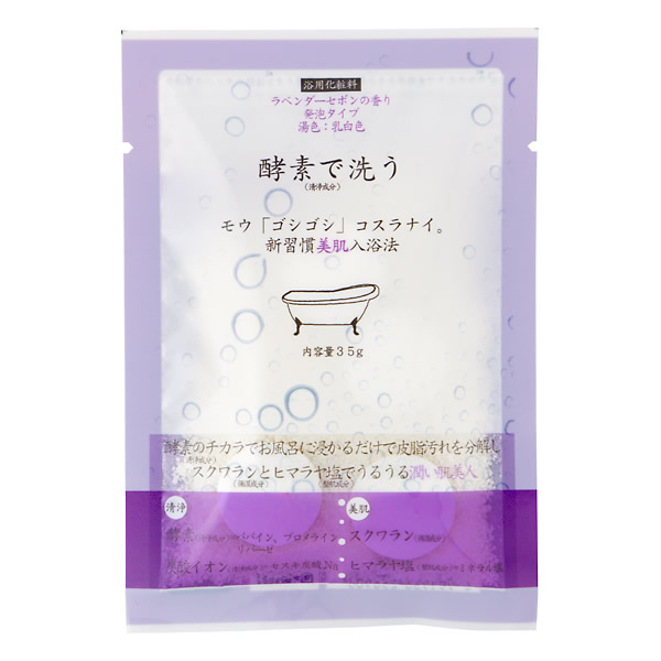 | 発泡成分が入ったタブレットと清浄・保湿・整肌成分が入ったパウダーで仕上げました。 [ラベンダーセボンの香り] 湯色:乳白色 酵素のチカラ(清浄成分)でお風呂に浸かるだけで皮脂汚れを分解し スクワランとヒマラヤ塩でうるうる潤い肌美人 |