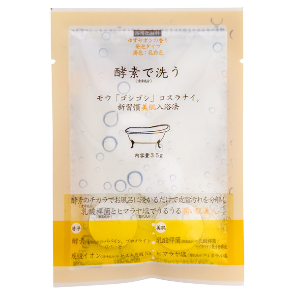 | 発泡成分が入ったタブレットと清浄・保湿・整肌成分が入ったパウダーで仕上げました。 [ゆずセボン] 湯色:乳白色 酵素のチカラでお風呂に浸かるだけで皮脂汚れを分解し 乳酸桿菌とヒマラヤ塩でうるうる潤い肌美人に。 |