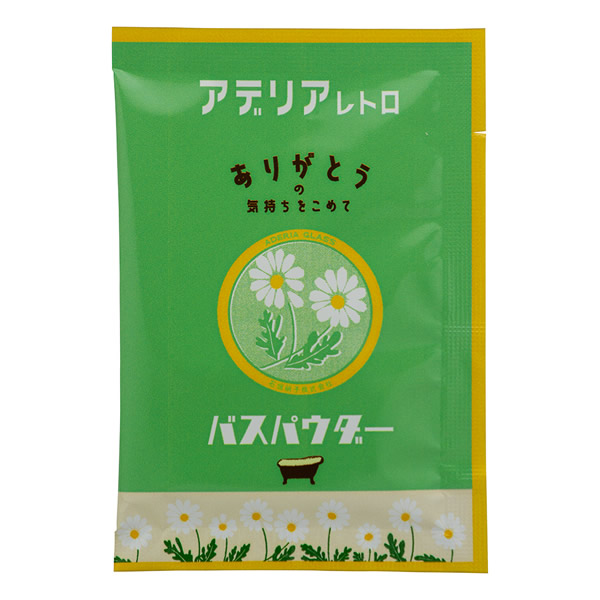 | レトロなデザインが可愛い入浴剤 「ありがとう」のさりげないメッセージ入。 [野ばな] フレッシュなフルーツの香りの入浴剤で 至福のバスタイムをお楽しみください。 アロエベラ葉エキス(保湿成分)配合 シトラスフルーツの香り 湯色:黄緑色 |