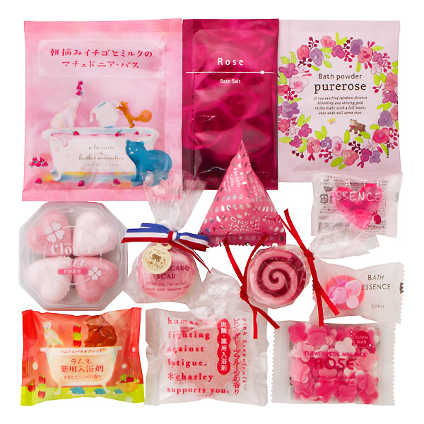 内容/発泡入浴剤アワアワ、ソムリエバスソルト、ソムリエバスタブレット、オンセン シャポン ジャポン、クローバーフィズ、ベジタブルソープ キャンディ、フラワーペタルバブルバスミニパック、プチマカロンソープ、フレグラントガーデン、パトモスバスエッセンス Sハート、パトモスバスエッセンス、サンハーブバスパウダーN×各1