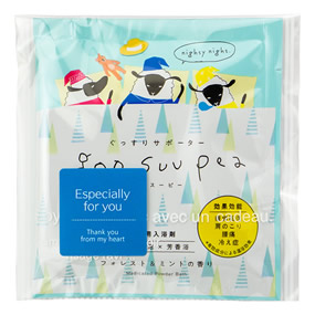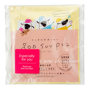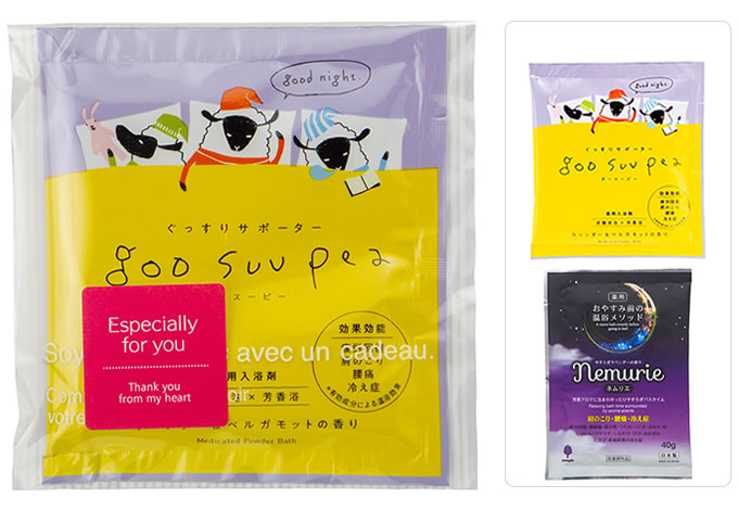 | 透明に白い文字の入ったOPP袋に、入浴剤が2つ重なって入っています。 袋の裏面はストライプ柄。 ※在庫状況により、内容が変更になる場合がございます。 |