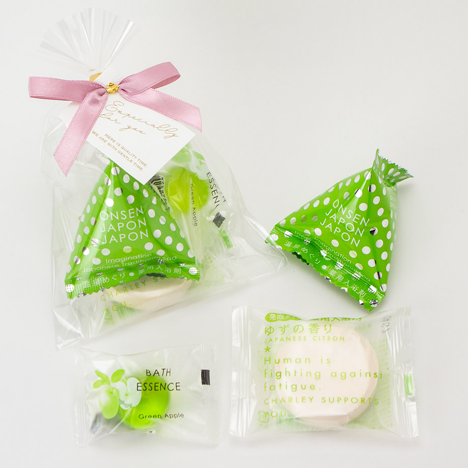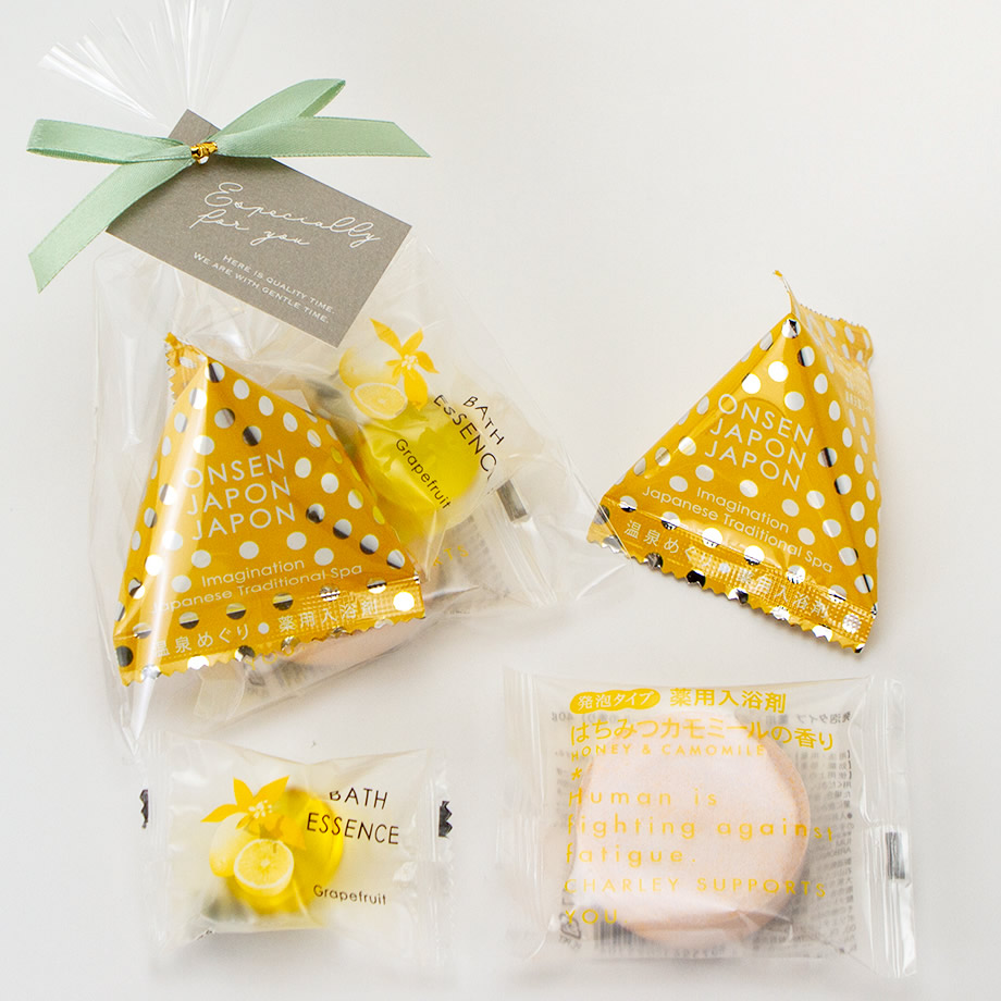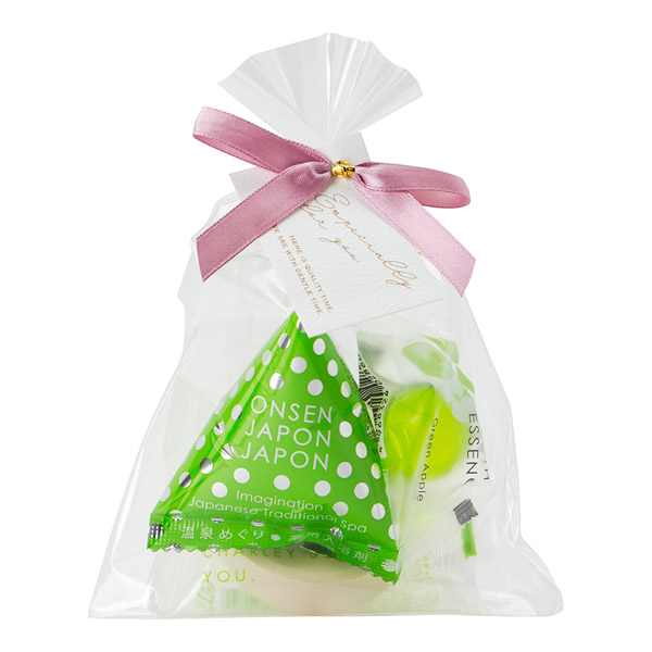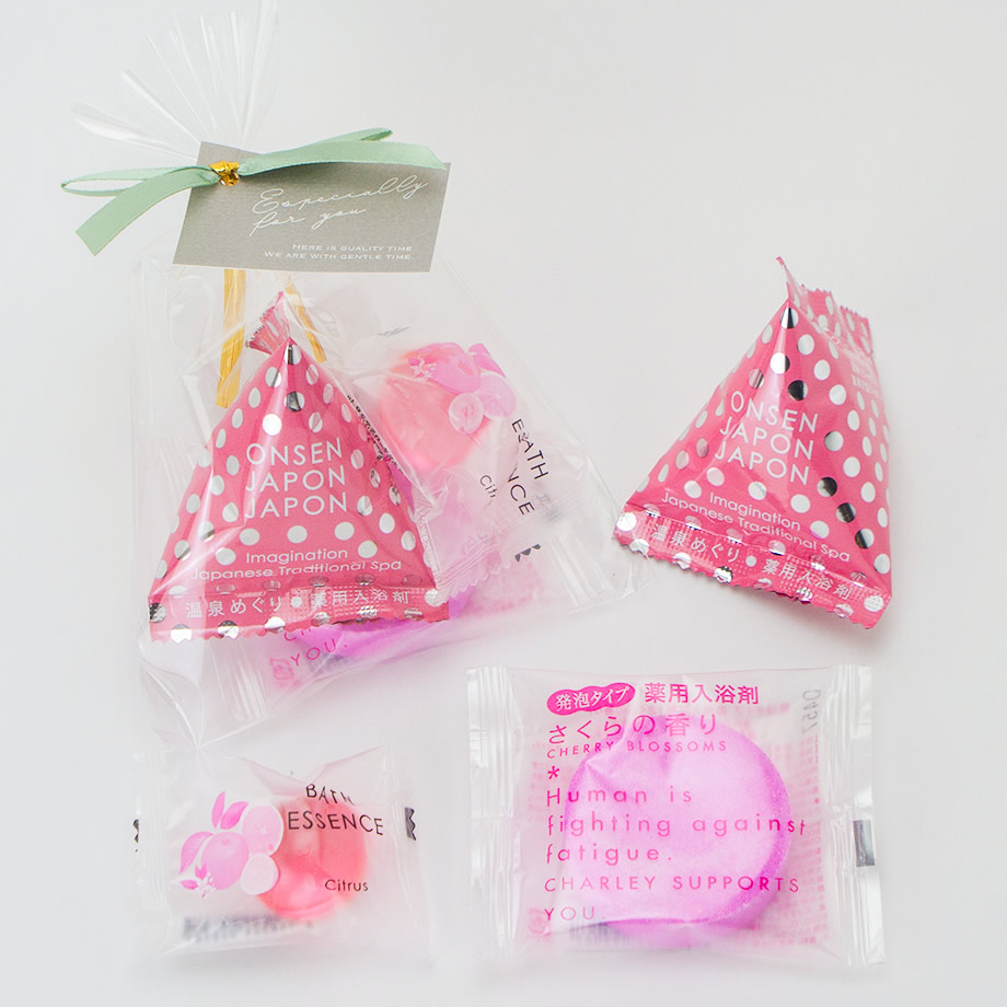 | 透明の袋に、入浴剤が3つ。 くすみカラーのリボンタイがかわいらしい、コロンとしたプチギフトです。 |
