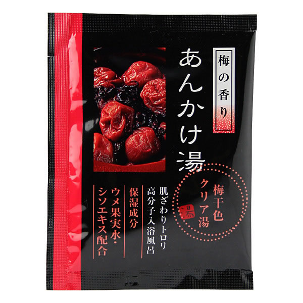 | 高分子(とろみ成分)がお湯を冷めにくくし、体をやわらかくつつみます。 [梅] ・シソエキス、ウメ果実水がしっとりとした湯あがり肌に。 ・梅の香り(天然精油成分)、梅干色の湯でリラックス。 |