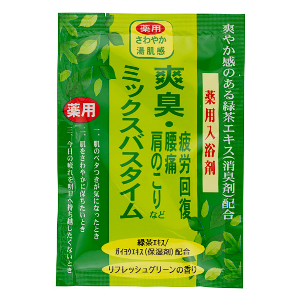 | 植物の恵みを目的に応じてミックスした入浴剤。 ミックスすることで、個性あふれる入浴感をお楽しみいただけます。 [爽臭ミックス] [薬用] さわやか湯肌感 爽やか感のある緑葉植物エキスをミックス 緑葉植物のフレッシュ感を味わえる爽臭系入浴剤。 肌を爽やかに保ちたいときやベタつきが気になったときにおすすめです。 消臭成分:緑茶エキス 保湿成分:ガイヨウエキス、アロエエキス、モモ葉エキス ●リフレッシュグリーンの香り ●クリアグリーンの湯色 [効能・効果] 疲労回復、肩のこり、腰痛、冷え性、しっしん、荒れ症、あせも、にきび、あかぎれ、 ひび、しもやけ、神経痛、くじき、うちみ、リウマチ、産前産後の冷え性、痔 |