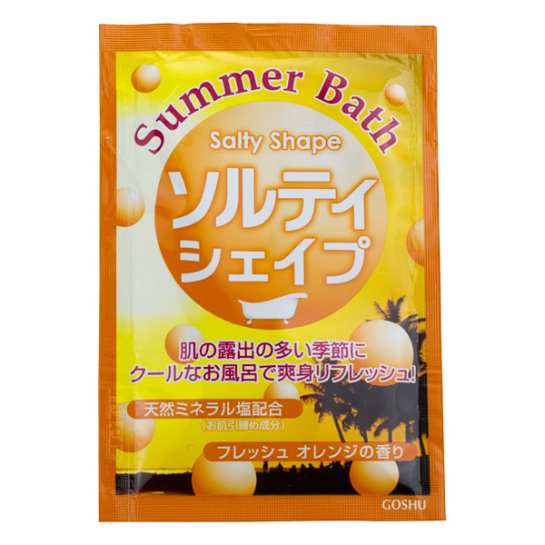 | クールなお風呂で爽快リフレッシュ [ソルティシェイプ] ・天然ミネラル塩の成分によりお肌をさっぱり引き締めます。 ・海藻エキス配合による保湿効果でしっとり滑らかにお肌を整えます。 ・パパイン酵素(整肌成分)配合でお肌をすこやかに保ちます。 ・オレンジの香りでゆったりリラックスバスタイムを演出します。 ●フレッシュオレンジの香り ●ライトオレンジの湯色 |