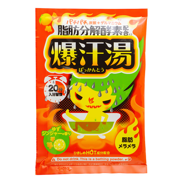 | ココロとカラダに溜まったものを、バスタイムでリセット! 頑張った1日の最後に、汗と一緒にスッキリ! [ゆずジンジャー] ホットイエローのお湯色(白濁イエロー) ●ひきしめHOT成分 トウガラシエキス・ショウガ根エキス(HOT成分)、岩塩(ひきしめ成分) ●脂肪分解酵素 リパーゼ(清浄成分) ●ゲルマニウム(保湿成分) ●パチパチッ炭酸(うるおい粒) ●温泉ミネラル(すべすべ成分) ●ユズ果実エキス(保湿成分) |
