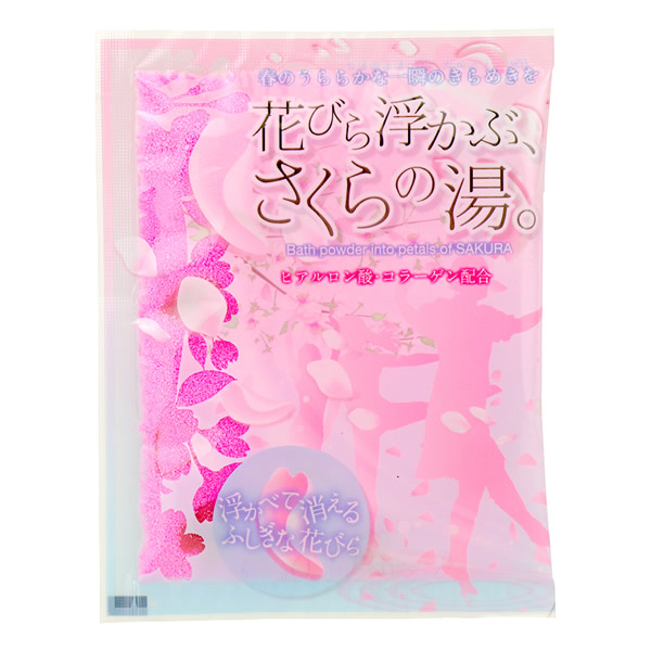 | 浮かべてしばらくするとお風呂に消える不思議な花びら入りの入浴剤。 ヒアルロン酸・コラーゲン・アーモンド油・桜葉エキス配合 |