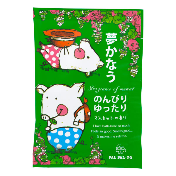 | 個性豊かなキャラクターが登場する色鮮やかなパッケージが特徴的な 夢かなうパルパルポー入浴剤シリーズです。 [のんびりゆったり マスカットの香り] マスカットの甘い香りでまったり気分を味わえます。 ブドウ葉エキスの保湿成分が、お肌を健やかに保ちます。 お湯の色:グリーン |