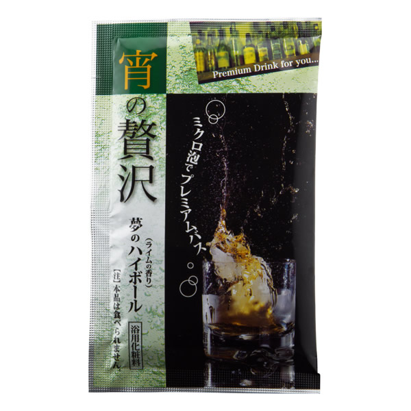 | 粉末発泡の新タイプの入浴剤。 シルクプロテイン、ヒアルロン酸(各うるおい成分)配合でしっとり潤い肌に。 [宵の贅沢 夢のハイボール] ライムの香りとミクロな炭酸泡があなたを包む |