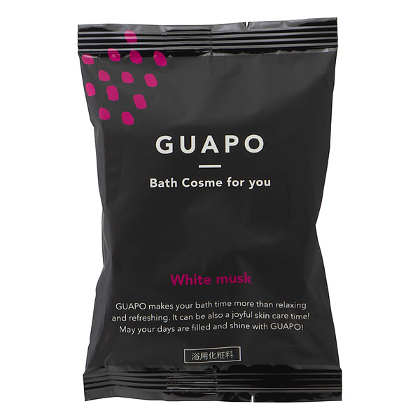 | 毎日を健康で美しく過ごすことを求める全ての人へ、ジェンダーレスな美容入浴料GUAPO。 潤い成分(キウイエキス、アーチチョーク葉エキス、ホホバ種子油、ユズセラミド、ビタミンC誘導体、スクワラン)配合 <肌へのいたわり処方> ●塩素除去 水道水に含まれる塩素を除去するための成分(アミノ酸誘導体)を配合しているため、さら湯特有のピリピリ感を低減し、やわらかく、なめらかな肌ざわりを体感できます。敏感肌でお困りの方にもおすすめです。 ●合成着色料フリー ●パラベンフリー ●アルコールフリー こだわりの無添加処方を採用しているため、3か月以上の赤ちゃんともご一緒にお使いいただけます。 [ホワイトムスクの香り] 魅惑的に華やぐホワイトムスクの香り 無色透明の湯 |