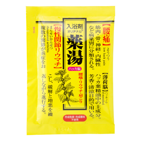 | お悩み別 「オリヂナル」の薬湯シリーズ [ハッカ脳] 入浴効果を高め、腰痛・リウマチ等に効果的 生薬精油配合 ・温浴効果を高めて血行を促進し筋肉の緊張を緩和します。 ・体をシンから温め、湯上がり後も保温します。 ・タール系色素および合成香料は使用しておりません。 ・柑橘類の橙皮、ユーカリ等の自然な香りです。 ・お湯に溶かすとビタミンB2の自然な黄色が広がります。 [効果・効能] 腰痛、リウマチ、肩のこり、神経痛、冷え症、うちみ、疲労回復、あせも、荒れ性、しっしんl、しもやけ、痔、ひび、にきび、あかぎれ、くじき、産前産後の冷え症 |