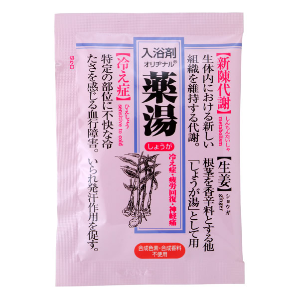 | お悩み別 「オリヂナル」の薬湯シリーズ [ショウガ] 入浴効果を高め、冷え症・疲労回復・神経痛等に効果的 生薬エキス・しょうが根精油(香料)配合 ・温浴効果による血行促進・発汗作用を高め新陳代謝を促します。 ・身体をよく温め、湯上り後もよく保温します。 ・しょうが根精油を植物精油の自然な香りとジンジャーイエローのにごり湯が疲れを癒します。 ・タール系色素および合成香料は使用しておりません。 [効果・効能] 冷え症、疲労回復、神経痛、しもやけ、あかぎれ、ひび、産前産後の冷え症、荒れ性、しっしん、あせも、にきび、腰痛、肩のこり、うちみ、くじき、リウマチ、痔 |